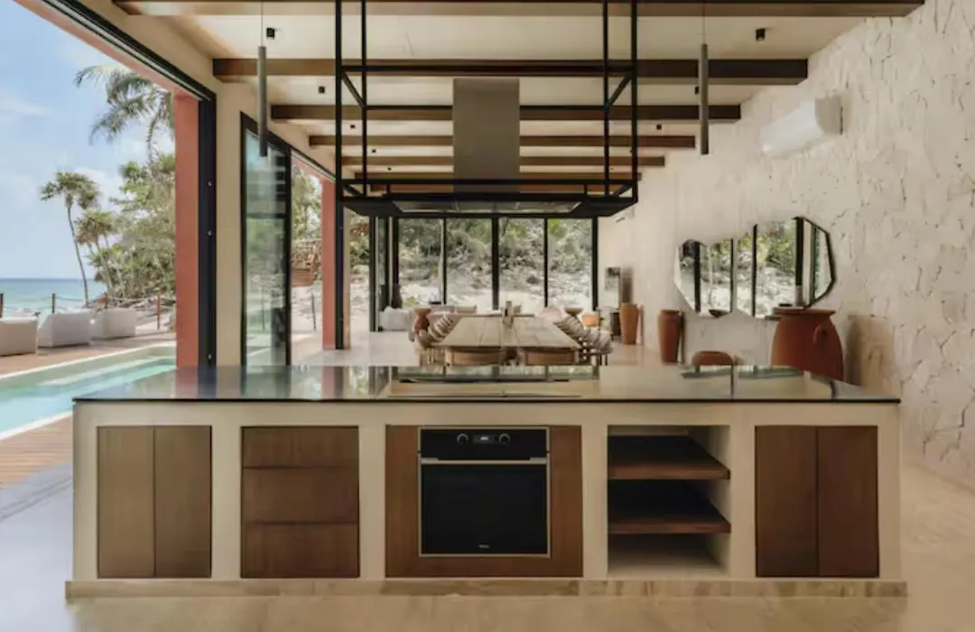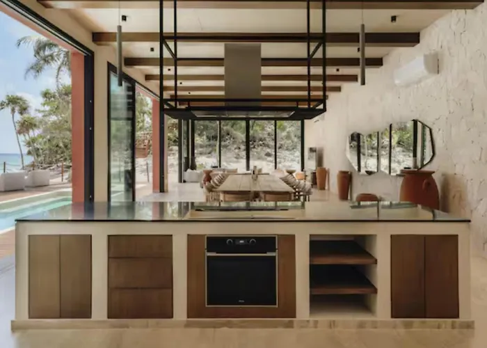 Beachfront Mansion For 24 Guests In Tulum Beach villa comes equipped with self-catering amenities, including a kitchenette area, and an outdoor dining area for guests to enjoy. There is also oven available in the kitchen. You can find a range of Mexican dishes at Puro Corazon set nearby, about 600 feet away.